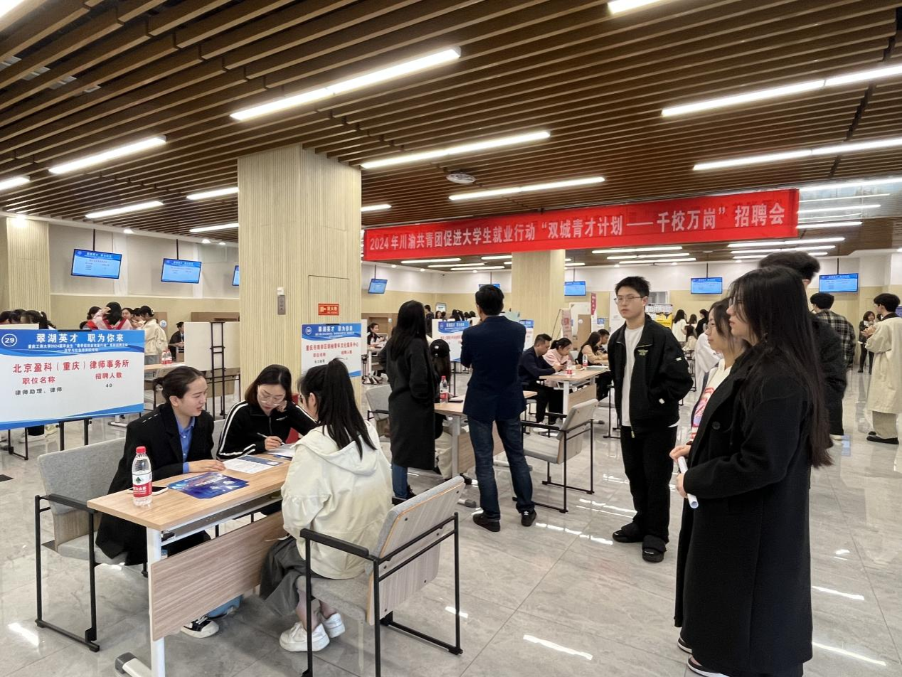 为深化实施“访企拓岗促就业”专项行动,全力做好学校2024届毕业生就业工作,2024年4月9日下午,由重庆市教委、重庆市人力社保局、共青团重庆市委、四川团省委联合主办,招生就业处、校团委承办,太阳成tyc234cc协办的“翠湖英才,职为你来”太阳集团tyc234cc2024届毕业生“春季促就业攻坚行动”系列招聘活动暨“双城青才计划——千校万岗”专场招聘会如期举办。