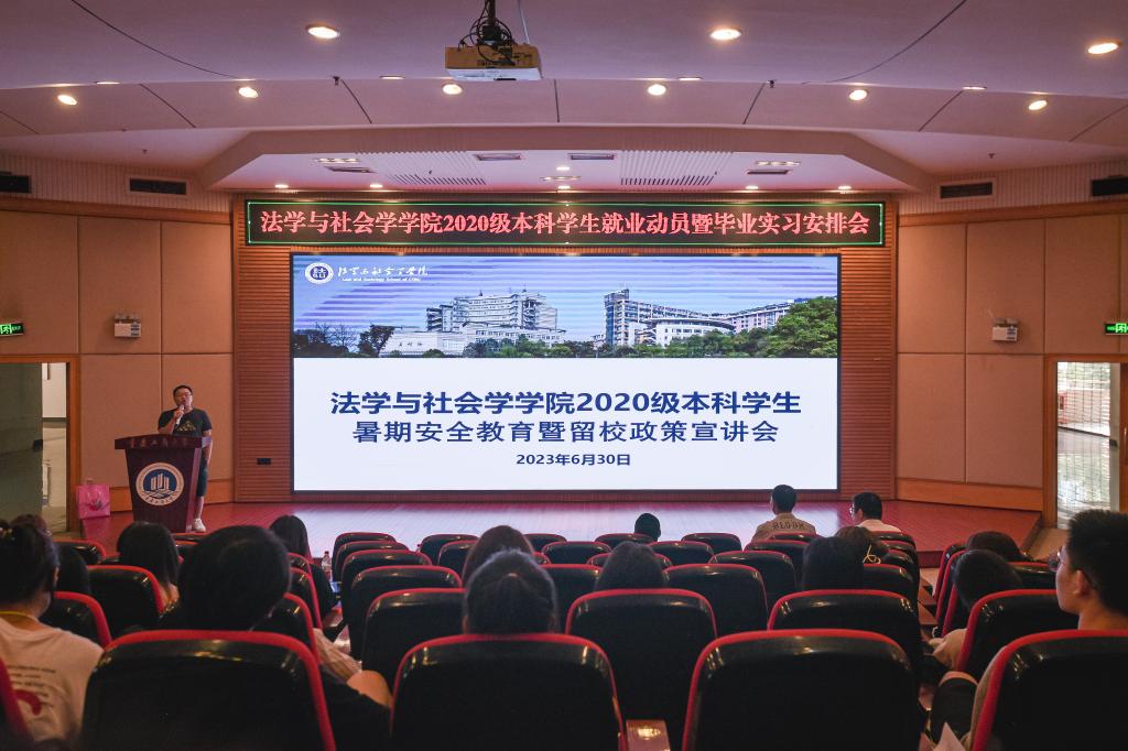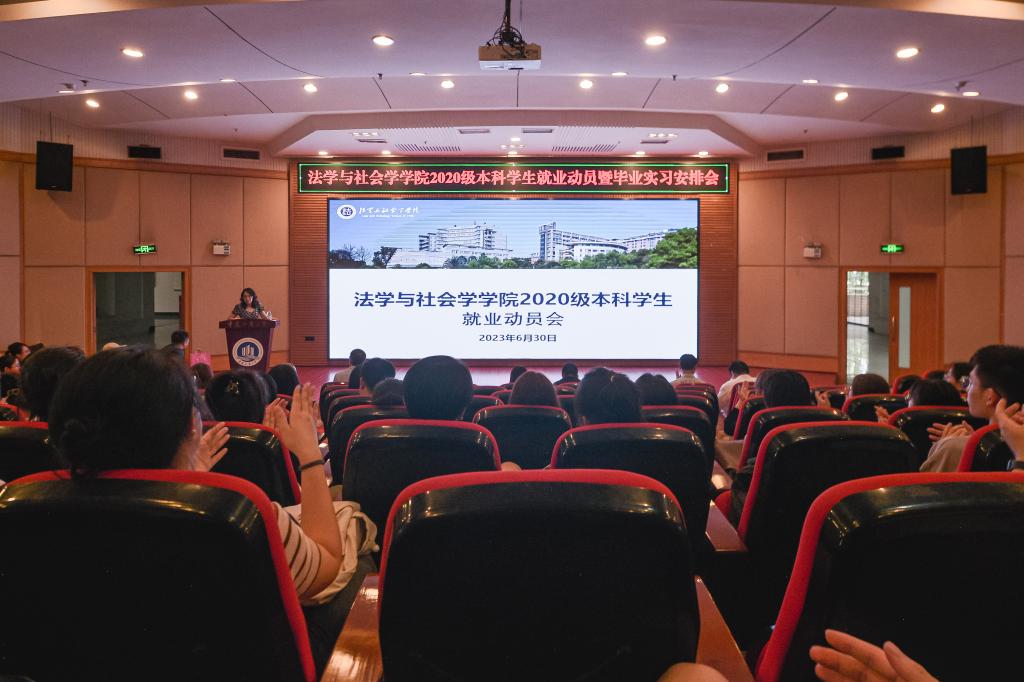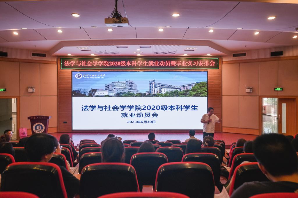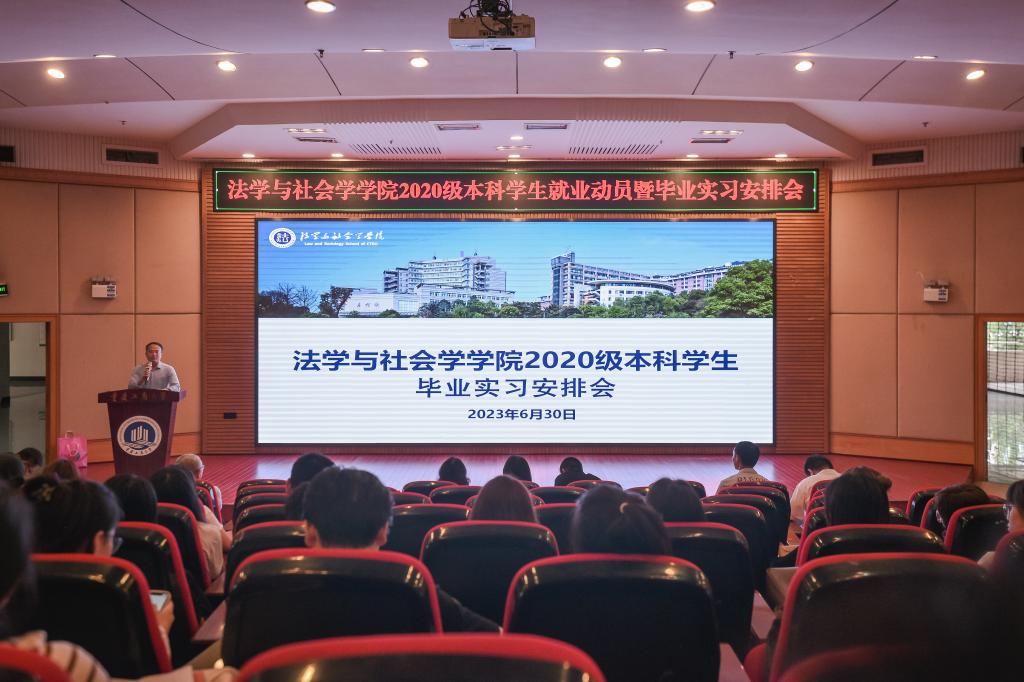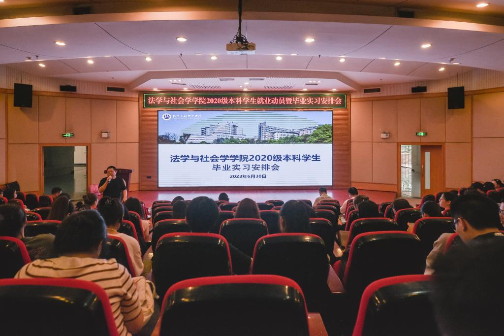 在毕业实习安排会上,侯明喜对同学们毕业实习工作提出了具体要求。侯院长希望同学们遵守法律法规与实习单位规章制度、服从单位的统一管理、提高安全防范意识、保持与老师的联系以及实习结束后按时返校,就毕业实习的重要性、目的、具体安排及注意事项进行讲解,强调要努力学习提高专业能力、尊重同事、努力工作,遵守实习单位和学校的相关规定、认真完成实习任务,重视毕业实习期间的各种安全。刘波介绍了法学类学生毕业实习工作安排及实习管理办法,对实习纪律、实习安排等进行了详细部署和解读。