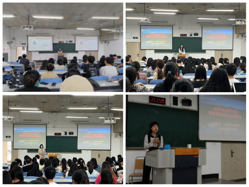 5月16日下午,2021级法学、知识产权专业学生参会。2019级知识产权专业学生徐英捷、谭渝昕,2019级法学专业朱桦溶、梁心然从考研、考公、法考、求职等方面为大家传经送宝。