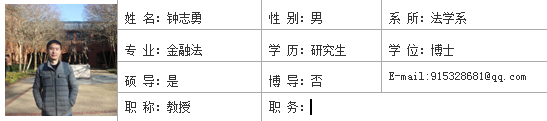 社会任职重庆市人大常委会立法咨询专家 讲授课程本科生:《国际法》、《国际经济法》等研究生:《票据法专题》、《银行法专题》等研究方向金融法个人简历教育背景1999/9-2002/6,厦门大学法学院攻读博士学位 1993/9-1996/6,陕西师范大学历史系攻读硕士学位,期间获英语自考本科文凭 1984/9-1987/6,岳阳师范学校(中专) 工作经历 2016/7-,太阳集团tyc234cc任教 2007/7-2016/6,南昌航空大学任教,期间受国家留学基金委资助在牛津大学法学院访学1年 2002/7-2007/6,中南大学任教,期间在商学院管理科学与工程博士后流动站做研究2年 1996/7-1999/8,天津大学任教 1987/7-1993/8,湖南省湘阴县南湖中学任教,期间获英语自考专科文凭 近年来讲授的主要课程 主要讲授课程为《国际法》、《国际经济法》、《票据法专题》等课程 个人荣誉学术成果:论文1、《电子支付市场监管问题比较研究》,独著,《河北法学》2018年第4期 2、《电子支付市场准入制度完善论》,独著,《上海金融》2018年第6期 3、《自由融资权与行政权的法律平衡》,独著,《行政论坛》2014年第3期(CSSCI来源期刊) 4、《自由融资权与刑罚权的冲突及解决》,独著,《刑法论丛》2014年第1期(CSSCI来源集刊) 5、《论中国民航销售代理业务管理法制之完善》,第一作者,《北京航空航天大学学报(社会科学版)》2011年第6期(CSSCI扩展版) 6、《银行卡责任承担规则之民法分析》,独著,《金融与经济》2009年第4期(北大核心期刊) 7、《网上支付中的风险承担机制研究》,独著,《上海金融》2007年第11期(CSSCI来源期刊) 8、《网上支付中的民事责任研究》,独著,《法学论坛》2007年第5期(北大核心期刊),全文转载于人大复印资料《民商法学》2007年第12期 9、《电子货币若干法律问题研究》,独著,《河北法学》2007年第9期(CSSCI来源期刊),全文转载于人大复印资料《经济法学》2007年第10期 10、《美国证券集团诉讼与我国证券民事诉讼形式之完善》,独著,《现代财经》2005年第11期(CSSCI来源期刊),全文转载于人大复印资料《诉讼法学》2006年第4期 11、《证券民事侵权诉讼前置程序与共同诉讼》,独著,《法律科学》2003年第6期(CSSCI来源期刊) 12、《网上支付中的消费者保护问题》,独著,《国际贸易问题》2002年第5期(CSSCI来源期刊),全文转载于人大复印资料《经济法学》2002年第8期 学术成果:著作 1、《电子支付服务监管法律问题研究》,独著,中国政法大学出版社2018年版 2、《网上支付中的法律问题研究》,独著,北京大学出版社2009年版 3、《跨国银行总行与海外分行法律关系论》,独著,中国方正出版社2005年版 学术成果:课题 1、主持《银行卡清算产业反垄断法规制研究》(17BFX104),国家社科基金一般项目,2017-2020 2、主持《非金融机构支付服务监管法律问题比较研究》(12YJA820103),教育部人文社科基金项目,2012-2014 3、主持《新农村建设中的金融法律制度改革与创新》(08FX14),江西省社科规划课题,2008-2010 4、主持《美国证券集团诉讼研究》,上海证券交易所联合研究计划第11期课题,2004 5、主持《网上支付中的法律问题研究》,中国法学会重点课题,会研字[2003]3号,2003 学术成果:获奖 独著《网上支付中的法律问题研究》于2011年获江西省第十四次社会科学优秀成果奖二等奖 |