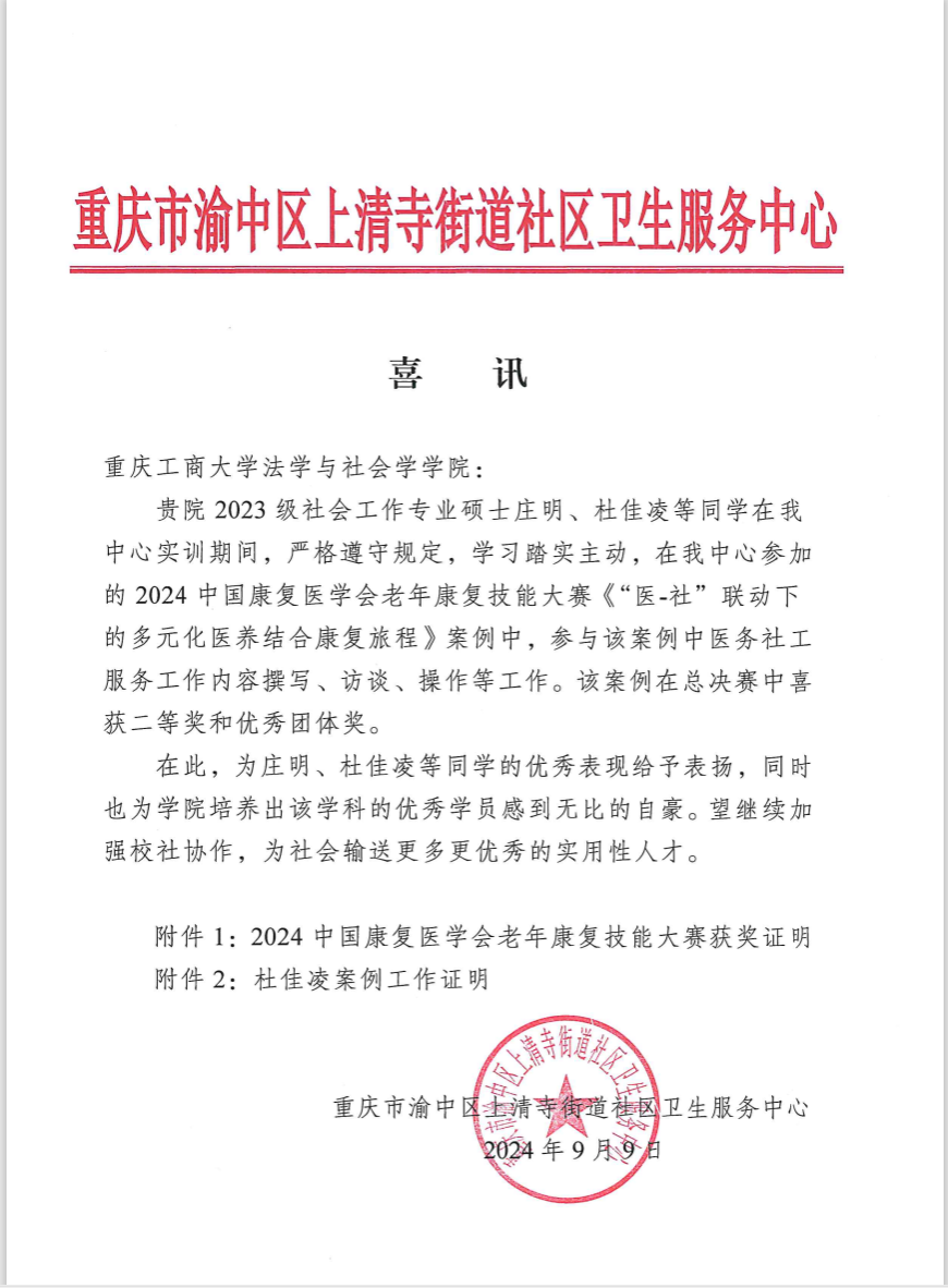 学院2名社会工作专业硕士荣获渝中区上清寺街道社区卫生服务中心表彰